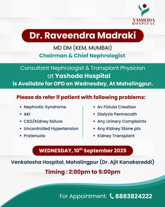 Experience Best Kidney Care at Yashoda Hospital’s Nephro-Uro Unit, led by Dr. Madraki — One of the Top Nephrologist in Vijayapura known for Expert Kidney Transplants and complex case management.